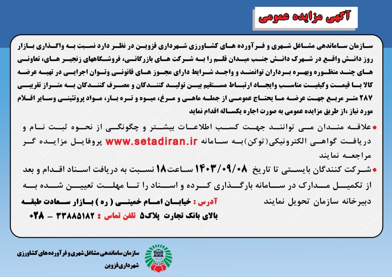واگذاری بازار روز دانش واقع در شهرك دانش جنب میدان قلم
